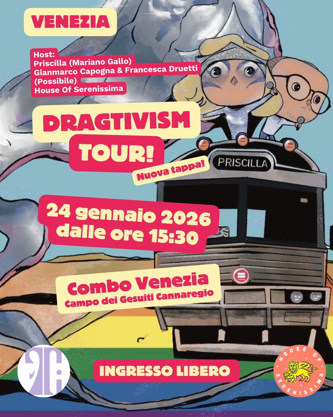 Ad aspettarvi PriscillaDrag, House of Serenissima, Progetto Tiresia, Gianmarco Capogna e Francesca Druetti di Possibile, insieme ai comitati di Possibile veneti e tant* altr*.