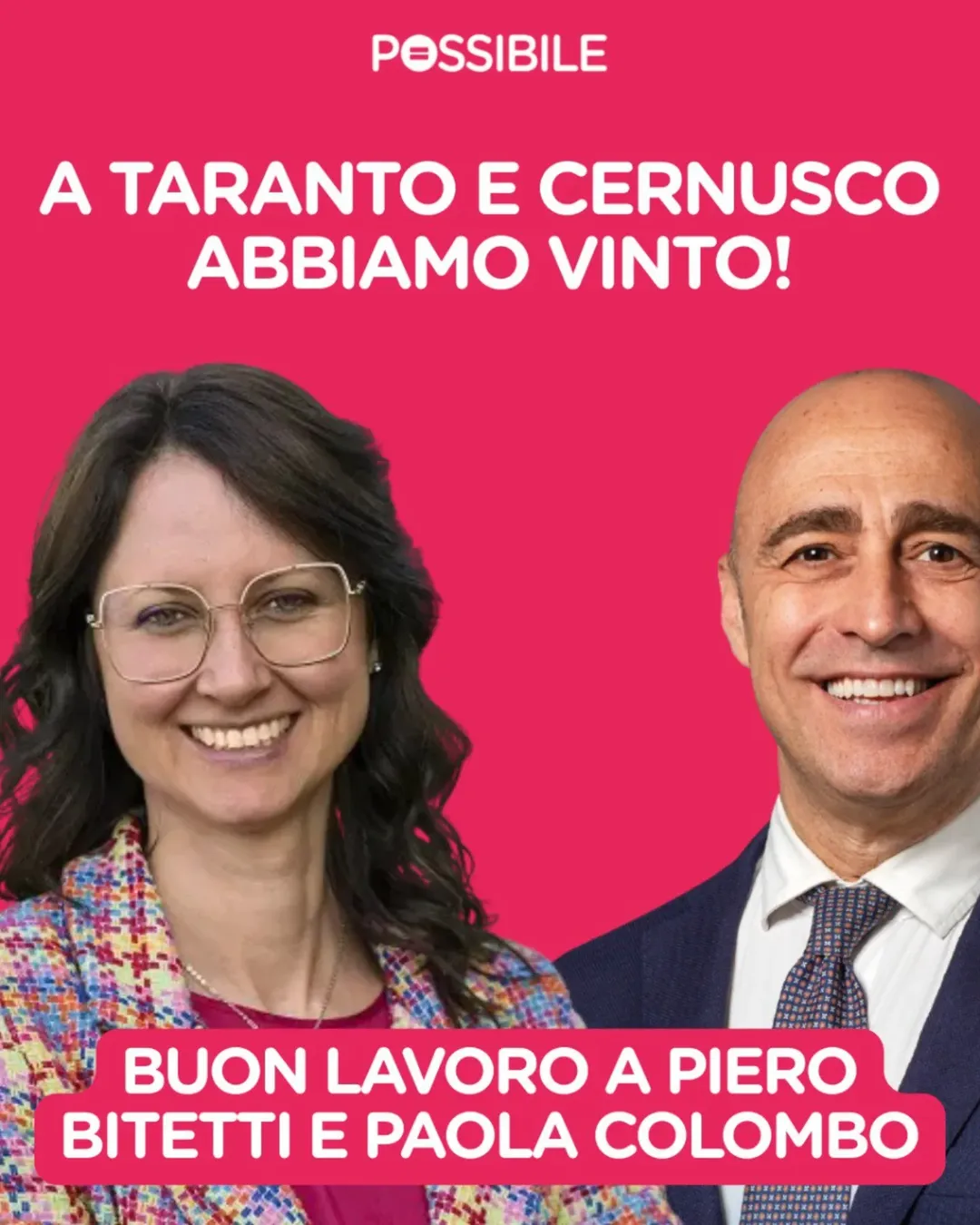 Ieri sono arrivate due belle notizie dalle elezioni comunali: Piero Bitetti e Paola Colombo, candidati sostenuti da Possibile, hanno vinto i ballottaggi a Taranto e Cernusco sul Naviglio!