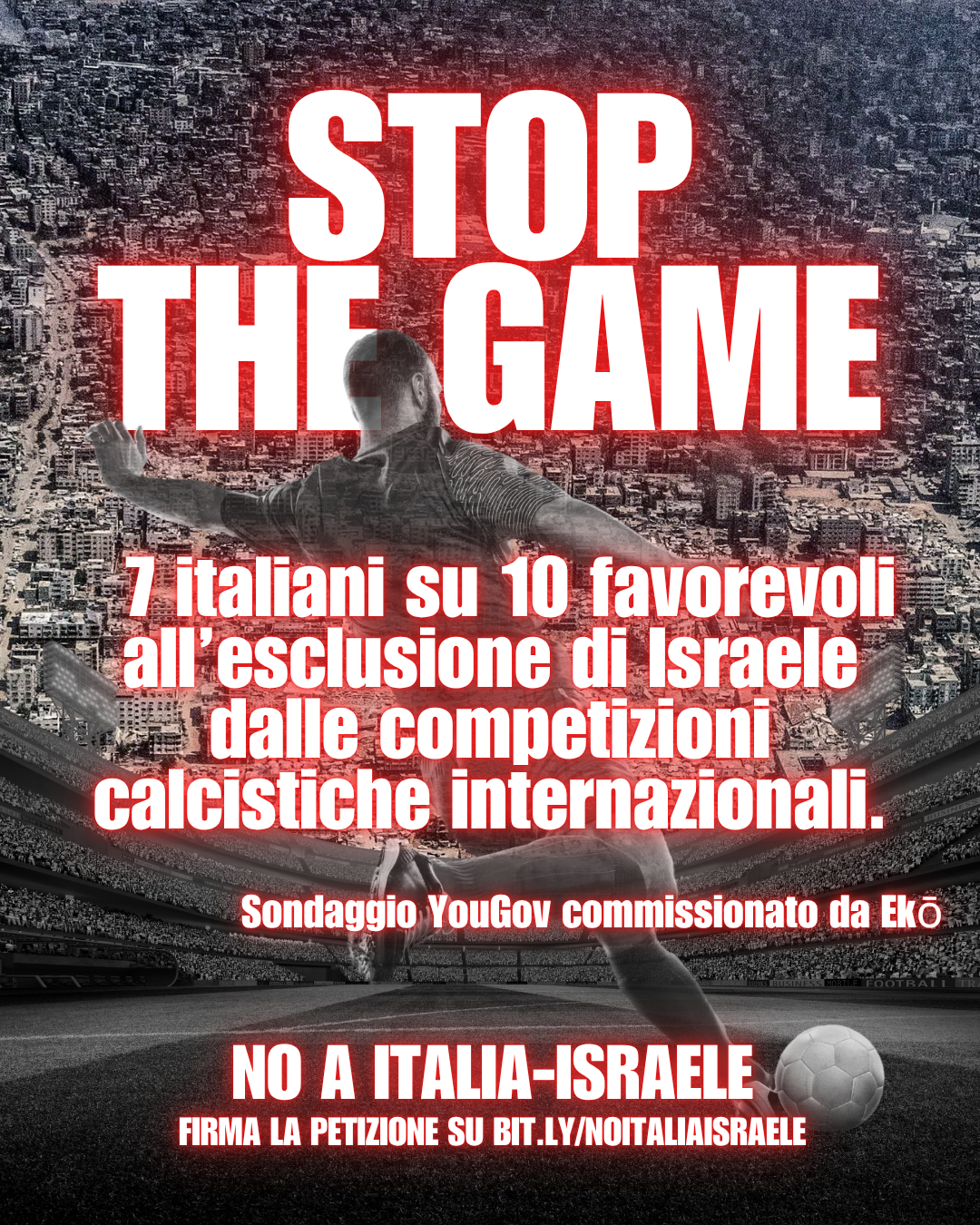 Come può disputarsi questa partita di calcio in queste condizioni? Non è solo sport: non lo era nel 2022 quando, quattro giorni dopo l’invasione militare del territorio ucraino, FIFA e UEFA hanno escluso la nazionale e le squadre di calcio russe dalle proprie competizioni, non lo è quando chiediamo di non disputare le grandi competizioni internazionali in Paesi in cui i diritti umani vengono sistematicamente violati. Di fronte a eventi bellici e violazioni del diritto internazionale, di fronte alla propaganda che la nazionale di uno Stato come Israele incarna, lo sport non può voltarsi dall’altra parte.